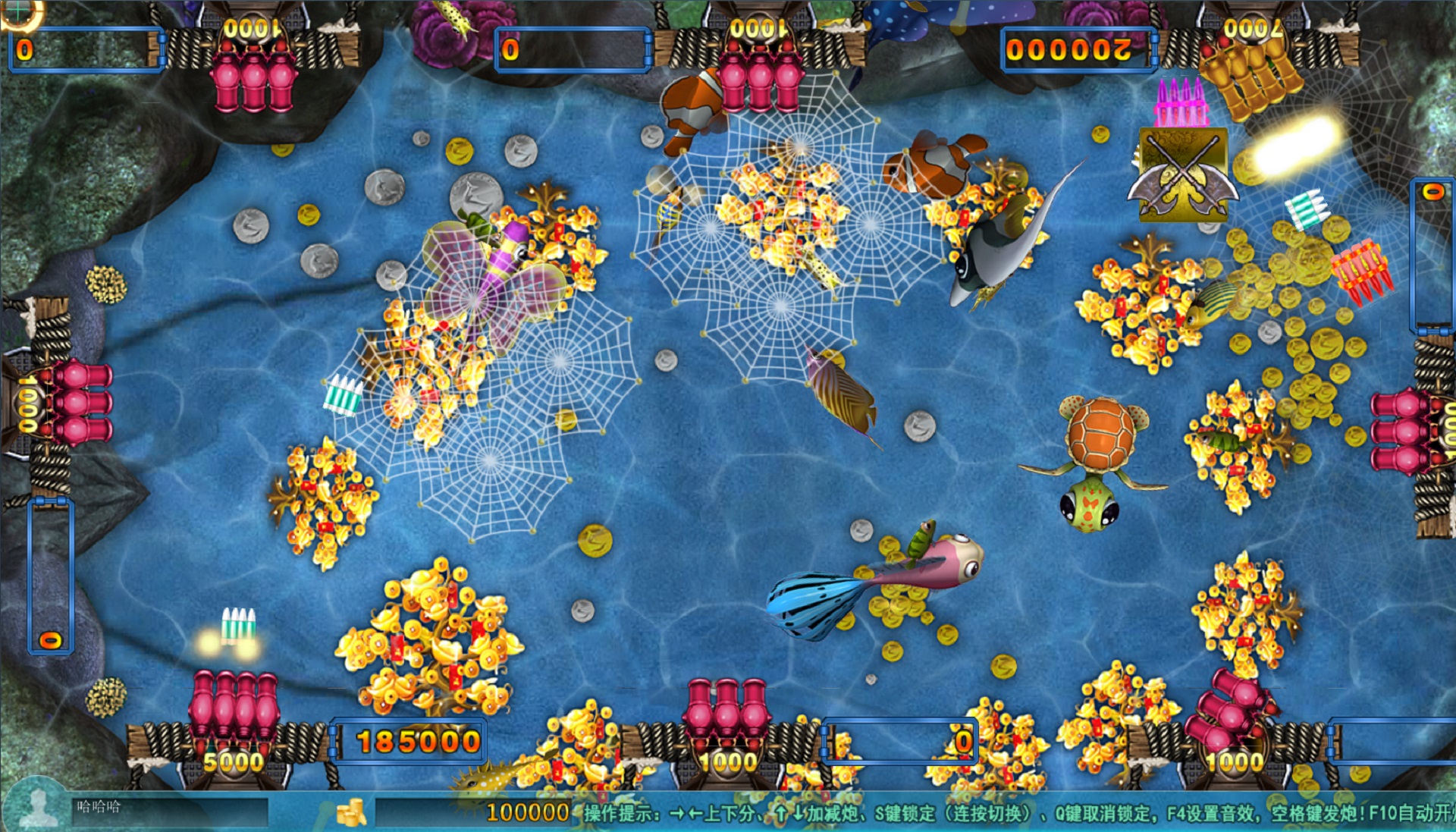 1、多种炮值按键盘“↑↓”键切换:1000-10000炮;鱼类的倍率为2-500倍;炮弹永不落空,无限反弹;选择不同的炮值打相同的鱼类得到不同的分值,炮值越大得到的分值越多。 2、李逵可通过不断劈鱼并吸收玩家炮弹将自己倍率从40增长到300多倍! 3、创新的局部炸弹、超级炸弹、定屏炸弹,三种炸弹强强联手,具有大规模的杀伤力。 4、创新的定屏炸弹,打中定屏炸弹得20倍奖励,并定住全屏所有的鱼,让玩家乐不思蜀的捕鱼。 5、强大的锁定功能,按“S”键可以锁定30倍以上的鱼或同类炸弹及组合的鱼,让大家不放过任何鱼类,按“Q”键可以取消锁定。 6、能量炮加快捕鱼速度,增强炮力,属于兵家必争之法宝!